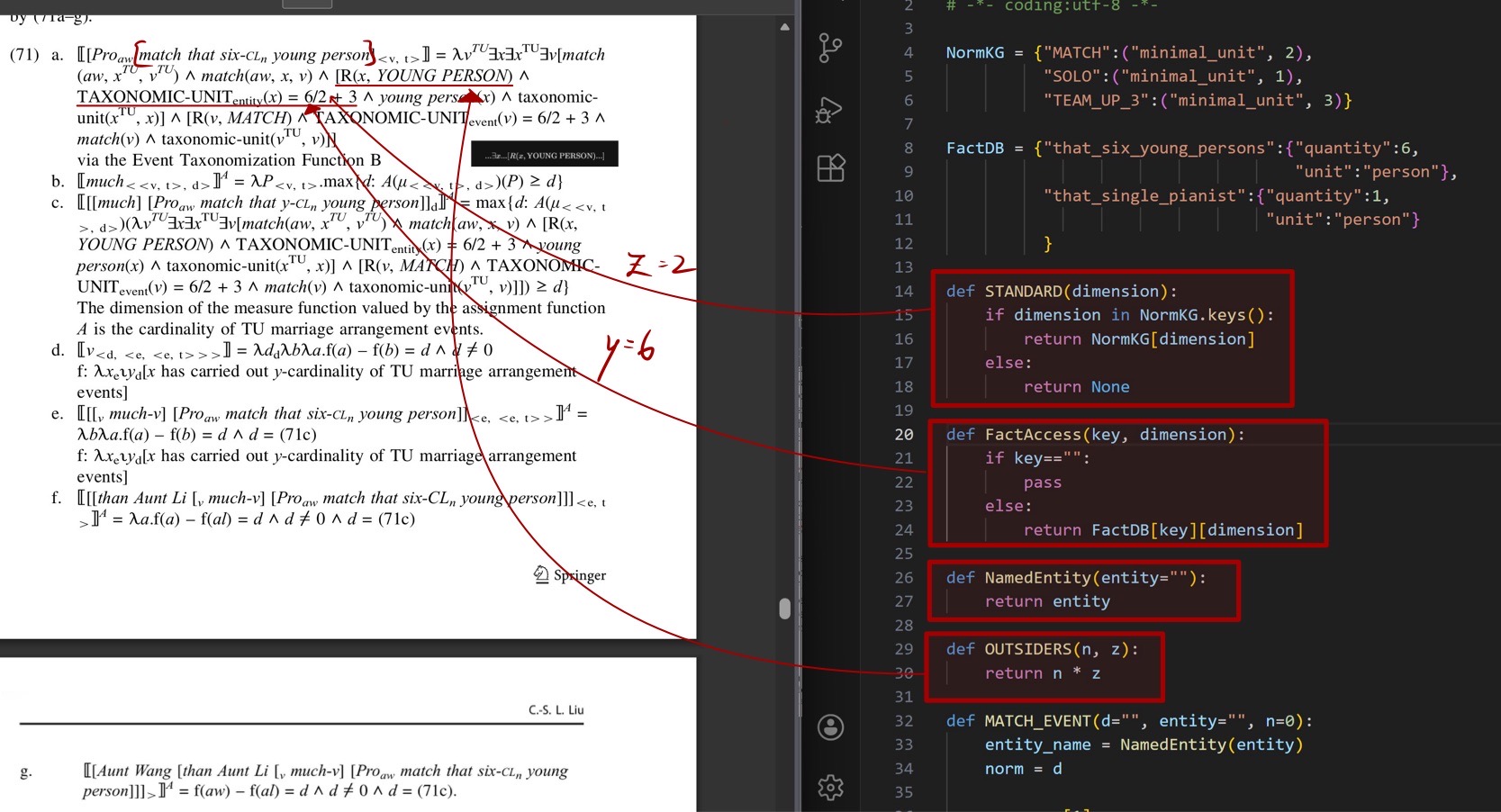 在實作過程中,必須將語意學中 λ-Expression 中的每一個抽象符號 (symbol),改寫為程式的變數 (variable) 以便進行後續的計算。舉例來說,為了計算「分類單位事件」(taxonomic unit event),我先決定在這個專案裡,名詞片語像「那六個年輕人」要被轉成一個整數 y,代表實際參與配對計算的「人數」;動詞「配對」本身的語意限制,則被轉成一個最小配對單位 z,例如一次配對必須是 2 人一組,這個數值由 STANDARD('MATCH') 回傳。